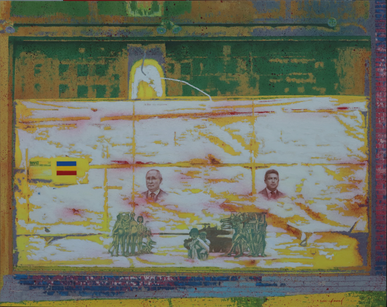 ‘내부수리중-전쟁의 비극’은 러시아와 우크라이나 통치자가 서로 외면한 채 나란히 붙어있는 은유적인 면모의 동질성을 앞세워 준비되지 않은 우크라이나를 침공한 점이 한국전쟁의 참상과 같은 맥락으로 표현했다.