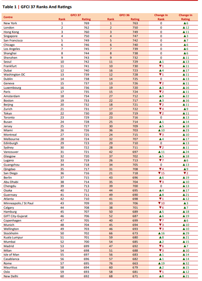 영국 글로벌 싱크탱크 컨설팅그룹 지옌(Z/YEN)사는 전 세계 119개 도시를 분석한 ‘국제금융센터지수(GFCI) 37차 보고서’를 한국 시간으로 어제(20일) 오후 6시(현지시간 3월 20일 오전 9시)에 발표했다.