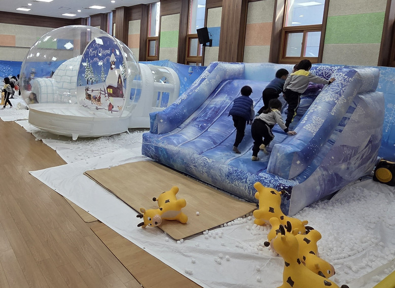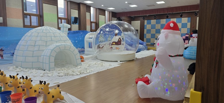 ‘눈꽃마을 놀이’는 ▲정상을 향해 계단을 올라 미끄럼틀처럼 내려오는 ‘눈꽃 썰매’▲얼음벽돌로 나만의 이글루를 만들어 보고, 눈송이를 바구니에 담아보는 ‘눈 놀이’▲하얀 눈송이로 가득 찬 ‘눈송이 풀장’▲포근한 공간에서 쉬어갈 수 있는‘이글루’▲눈송이를 대포에 담아 높이 발사해보는‘눈꽃대포’▲대형 눈 풍선 안에서 신나게 뛰어볼 수 있는 ‘에어돔’▲눈꽃마을을 탐험하며 이동하는 ‘호핑말’등으로 구성되어 유아들이 자유롭게 선택해 즐길 수 있었다.