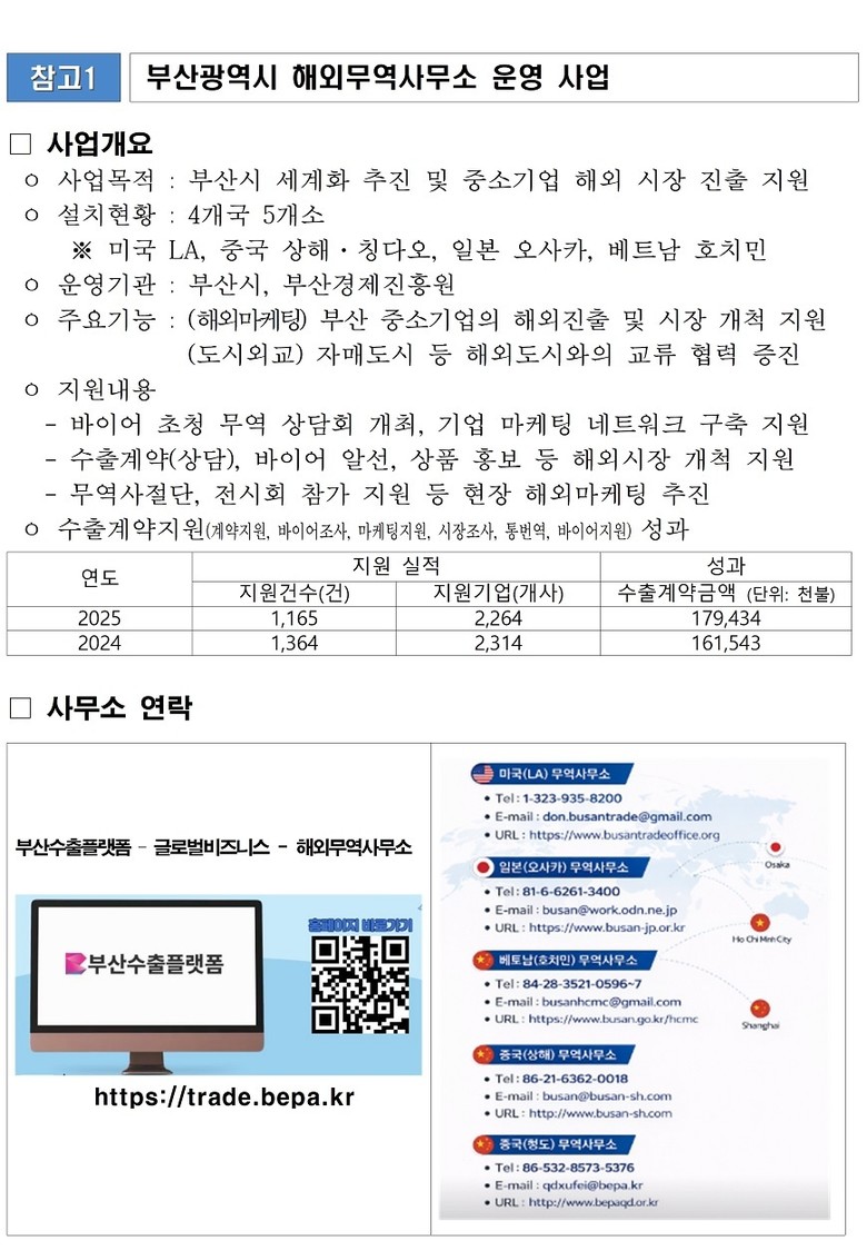 해외무역사무소 지원을 희망하는 기업은 해외무역사무소 홈페이지 또는 부산수출플랫폼(trade.bepa.kr)을 통해 언제든 문의하면 된다.