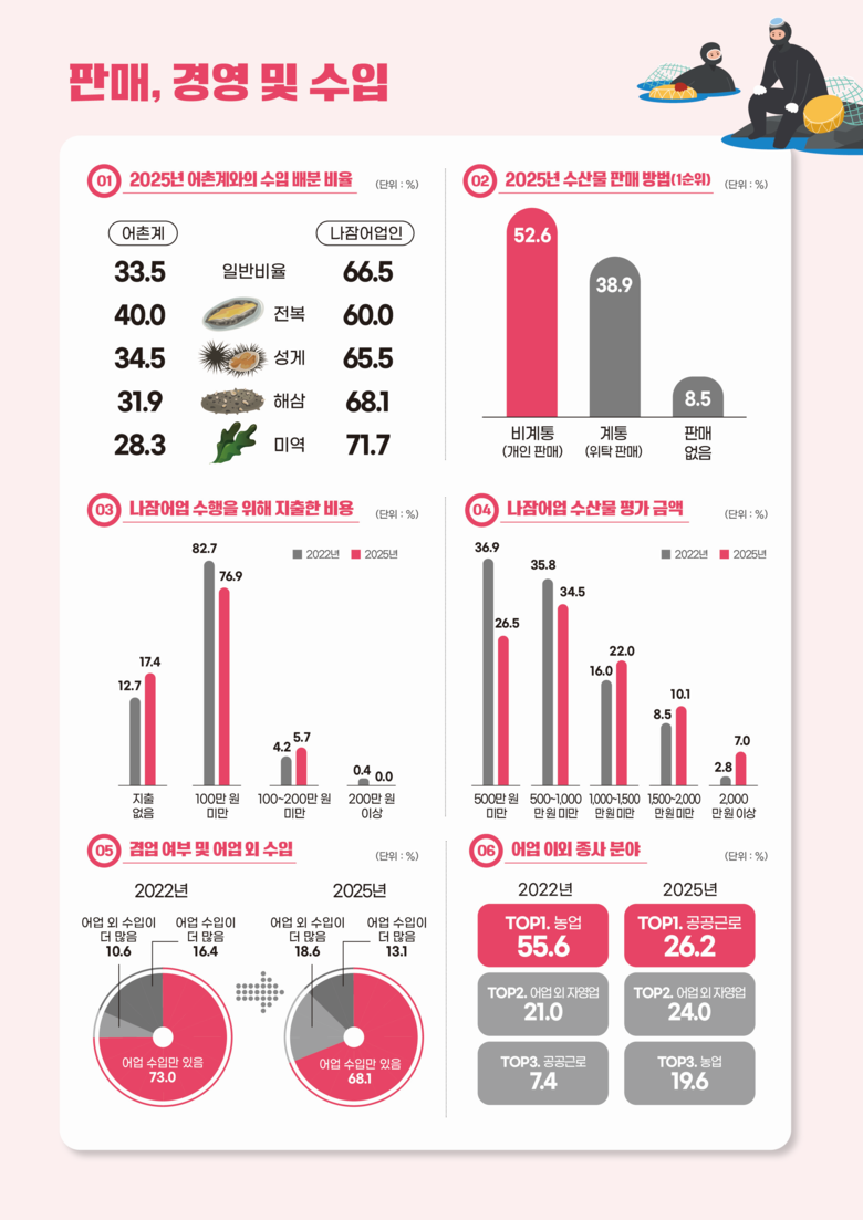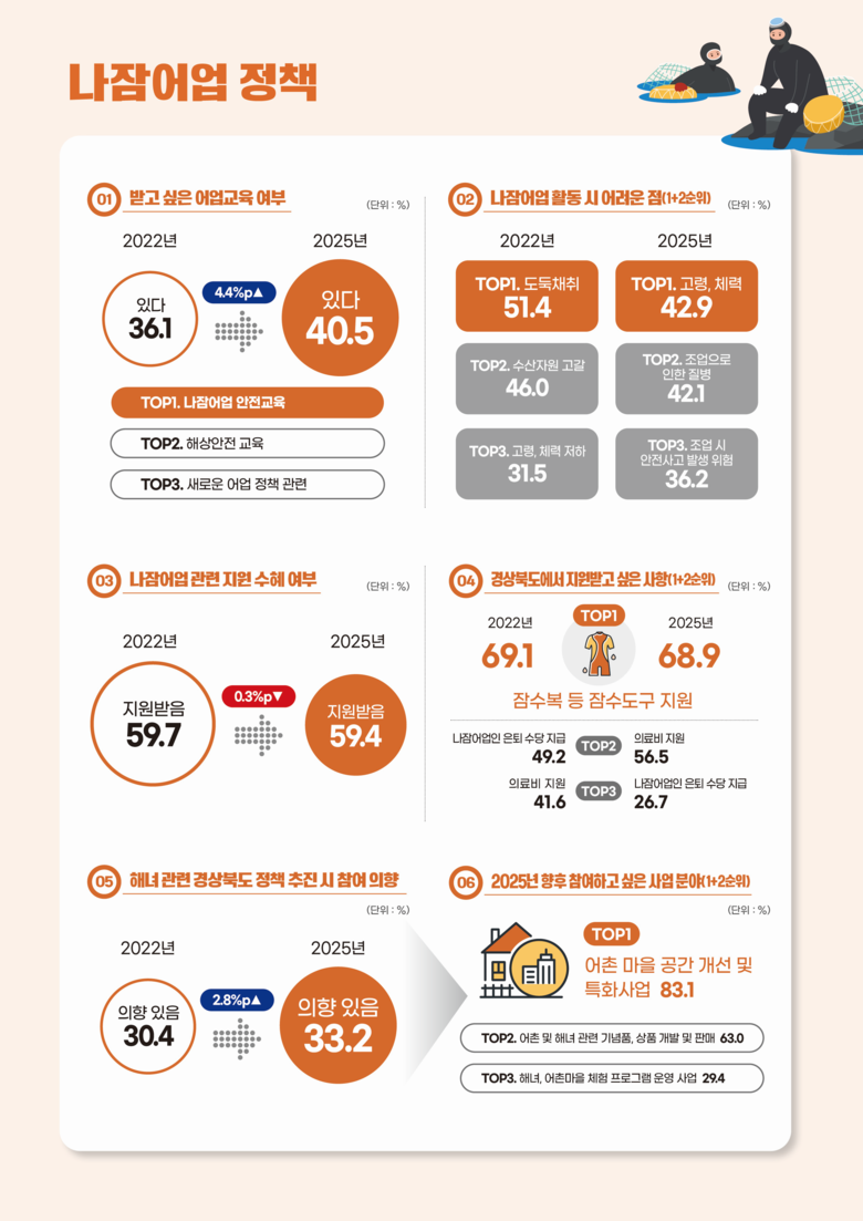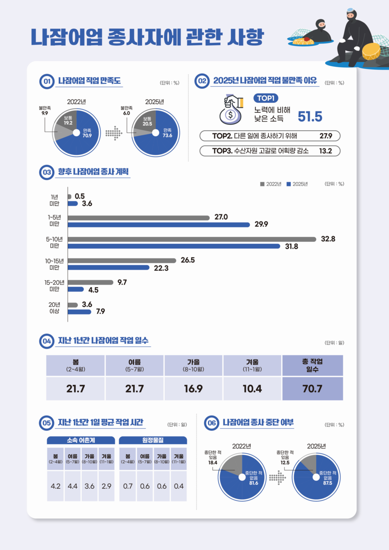 나잠어업 종사 경력의 평균은 37.2년으로, 전 주기(2022년) 대비 3.3년 감소하였으며, 향후 20년 이상 나잠어업을 지속할 계획이라고 응답한 비율은 7.9%로 전 주기 대비 4.3%p 증가해 장기 종사 의향이 확대된 것으로 나타났다.