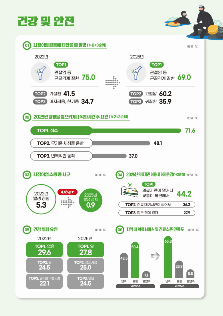 건강과 관련 1~3순위 응답 내용을 합한 결과, 나잠어업에 지장을 준 주요 질병은 ‘관절염 등 근골격계 질환’(69.0%), ‘고혈압’(60.2%) 순으로 나타났고, 질병을 일으키거나 악화시킨 주요인으로는 ‘잠수’(71.6%),‘무거운 채취물 운반’(48.1%) 순으로 나타났다.