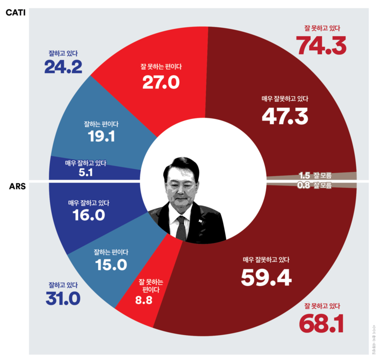 같은 시기에 진행한 ARS조사 결과 ‘긍정’평가는 2.0%p 상승한 31.0%, ‘부정’평가는 2.5%p 하락한 68.1%로 집계되어 37.1%p의 격차를 보였다. 서울과 충청권, 강원·제주에서 긍정평가가 상승했지만 모든 지역의 ‘부정’평가 우세가 유지되었다. 18~29세, 40·50대, 70세 이상에서 ‘긍정’평가 상승, ‘부정’평가 하락하며 70세 이상은 ‘긍정’평가 우세로 바뀌었다. 중도층은 ‘긍정’평가 1.5%p 상승, ‘부정’평가는 1.6%p 하락하며 ‘긍정’평가 27.7%, ‘부정’평가 72.0%를 기록했다(격차 44.3%p).