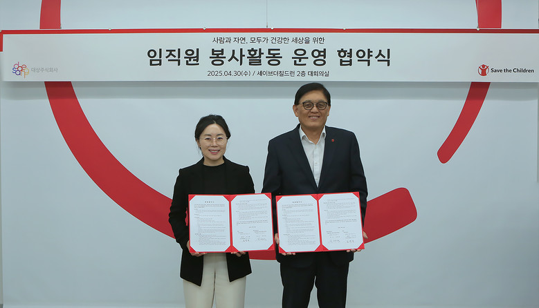 4월 30일 서울 마포구 세이브더칠드런 본사에서 열린 ‘임직원 봉사활동 운영 업무 협약 및 후원금 전달식’에는 김경숙 대상㈜ ESG경영실장과 정태영 세이브더칠드런 코리아 총장 등이 참석했다.