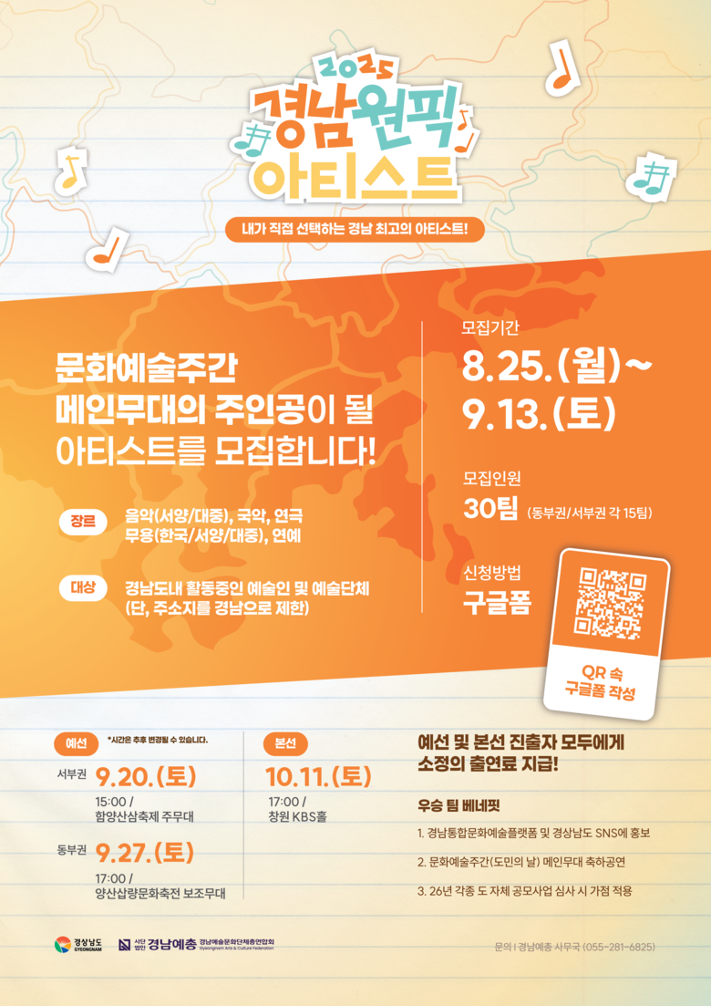 신청자 중 영상 심사를 통해 총 30개 팀이 1차로 선발되며, 이들은 지역 대표 축제와 연계된 예선 무대에 오른다. 서부권은 9월 20일(토) 함양산삼축제, 동부권은 9월 27일(토) 양산삽량문화대축전에서 예선이 열리며, 여기서 선발된 10개 팀은 10월 11일(토) ‘도민의 날’ 문화예술주간에 창원 KBS홀에서 열리는 결선 무대에 진출한다.