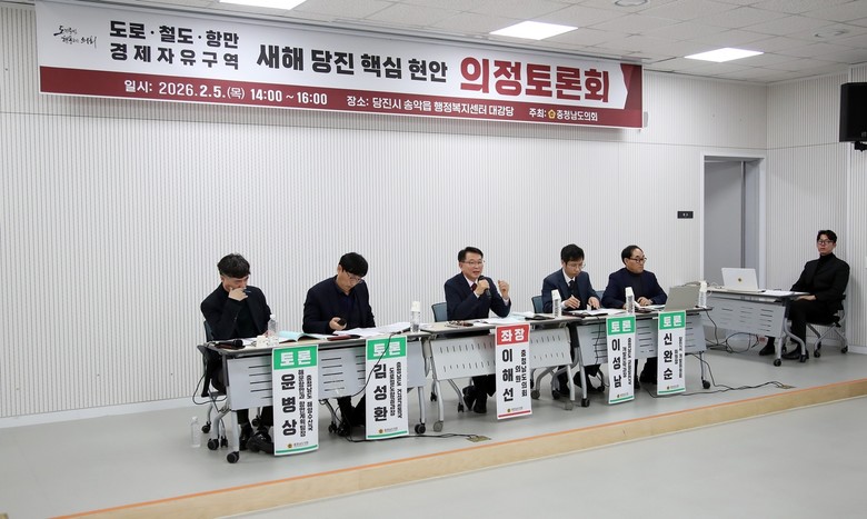 [충남 세계타임즈=이현진 기자] 충남도의회는 5일 당진시 송악읍 행정복지센터 대강당에서 ‘도로·철도·항만·경제자유구역, 새해 당진 핵심 현안’을 주제로 의정토론회를 열고, 당진 지역 대형 SOC 및 산업 인프라 사업의 추진 현황과 대응 방안을 종합적으로 논의했다.