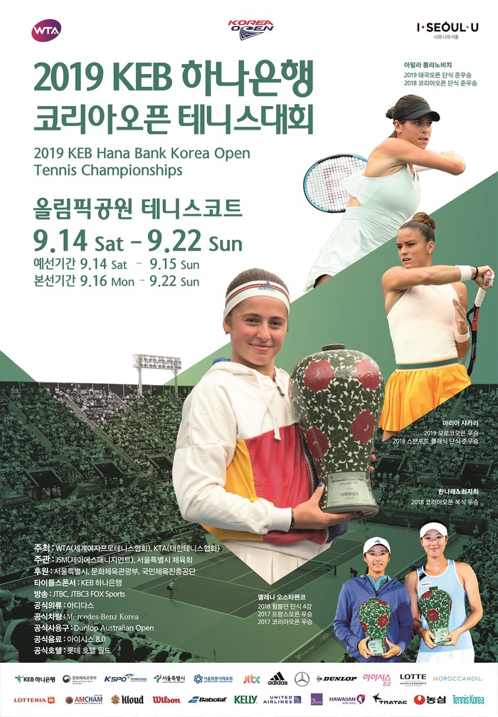 서울특별시체육회(회장 박원순)가 JSM(제이에스매니지먼트)와 공동으로 주관하고 서울시와 문화체육관광부가 후원하는 ‘2019 KEB 하나은행 코리아오픈 테니스 대회’가 오는 9월 14일(토)부터 22일(일)까지 9일 간에 걸쳐 올림픽공원 테니스코트에서 개최된다.