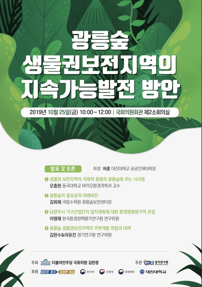 토론회는 허훈 광릉BR관리위원회 부위원장이 좌장을 맡고, 오충현 동국대 바이오환경과학과 교수, 김희채 국립수목원 광릉숲보전센터장, 이영재 한국환경정책평가연구원 연구위원, 김한수·이유진 경기연구원 연구위원이 발제자로 참여한다.