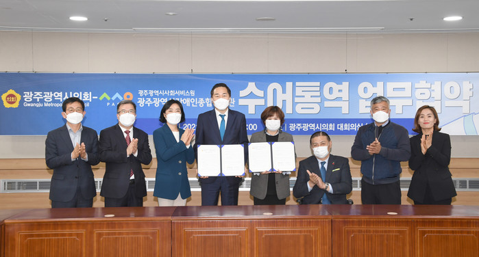 [광주=세계타임즈 손권일 기자] 광주광역시의회(의장 김용집)와 광주광역시장애인종합복지관(관장 김미란)이 ‘수어통역 서비스’ 지원 업무협약을 체결했다.