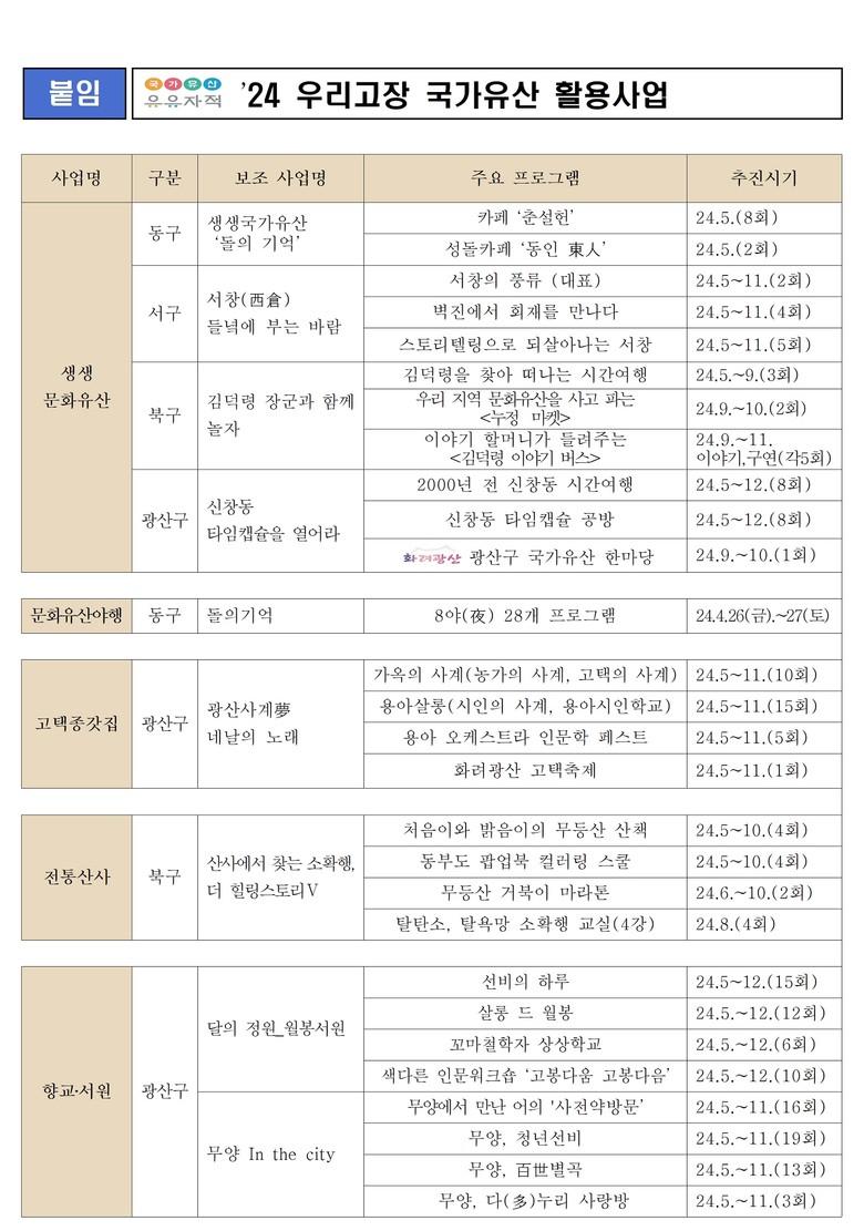 또 춘설헌‧광주읍성 문화유산을 배경으로 한 ‘돌의 기억’, 용아생가·김봉호 가옥·장덕동 근대한옥을 배경으로 한 ‘광산 사계 몽(夢)’ 등은 ‘우리고장 국가유산 활용사업’으로 선정돼 체험 프로그램 등을 운영한다.