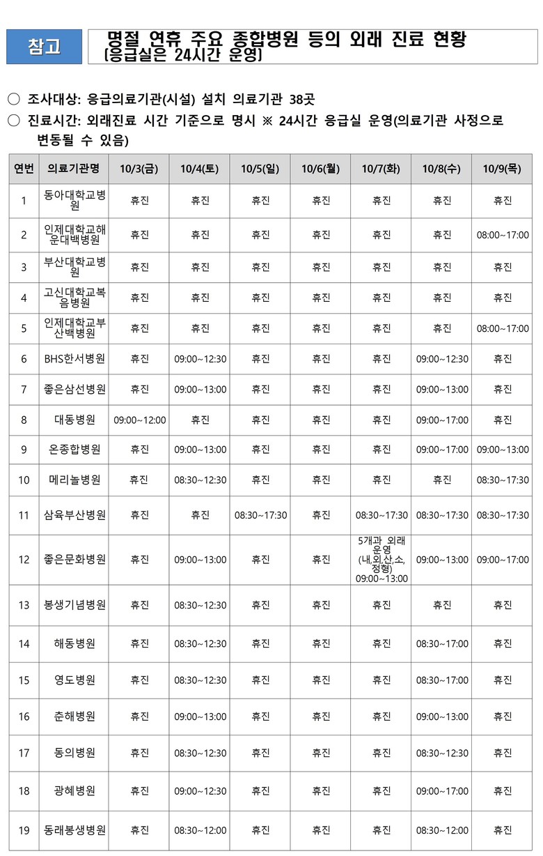 동아대학교병원, 부산대학교병원, 고신대학교복음병원 등은 추석 연휴 전 기간 외래진료를 멈추지만, 응급실은 24시간 열려 시민의 위급 상황에 대비한다.
