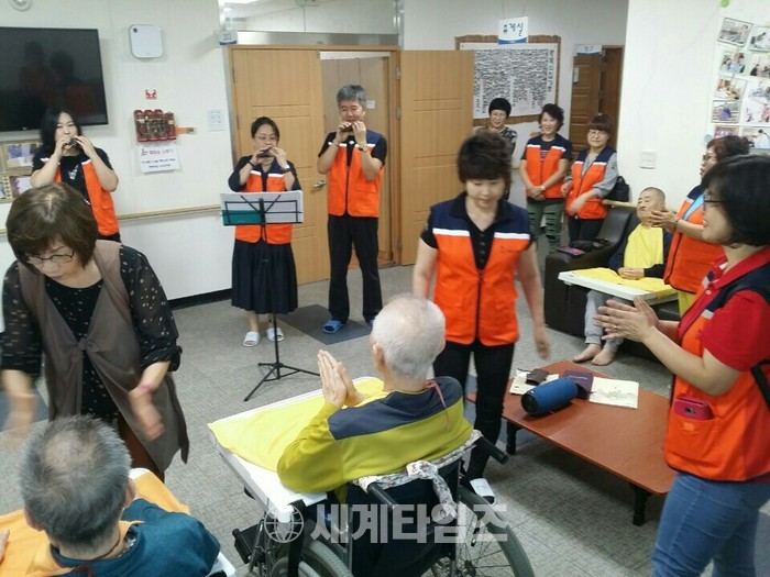[대전=세계타임즈 이장성 기자] 5천명의 회원들이 활동하는 자발적인 SNS봉사 밴드인 사랑의 사다리 밴드(리더 이정제)는 12일 오전9시~오후1시까지 충북 청주시 서원구 현도면에 위치한 꽃동네 행복의집 소망요양원(원장 김순녀 시몬수녀)에서 치매와 와상어르신들 50분께 미용 및 말벗봉사 그리고 오카리나 연주 봉사로 훈훈한 이웃사랑을 전했다.