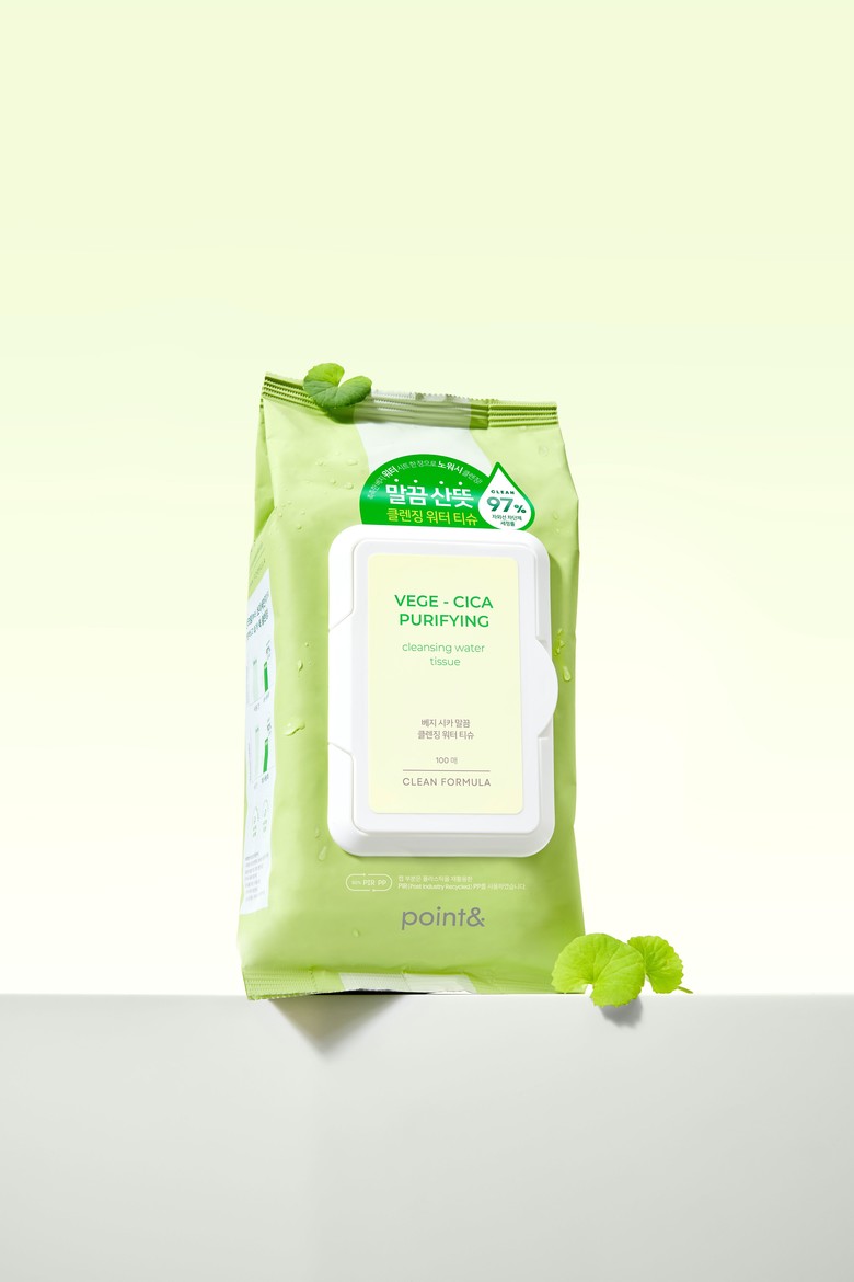포인트앤 베지 시카 말끔 클렌징 워터 티슈는 저온 공법으로 추출한 베지(VEGE) 복합물과 병풀추출물 등 다섯 가지 시카(CICA) 성분이 혼합된 베지-시카 콤플렉스를 함유해 외부 자극으로부터 피부를 보호하고 무너진 피부 장벽 강화에 도움을 준다. 뿐만 아니라 히알루론산 성분을 함유해 피부 보습 유지에도 도움을 준다.
