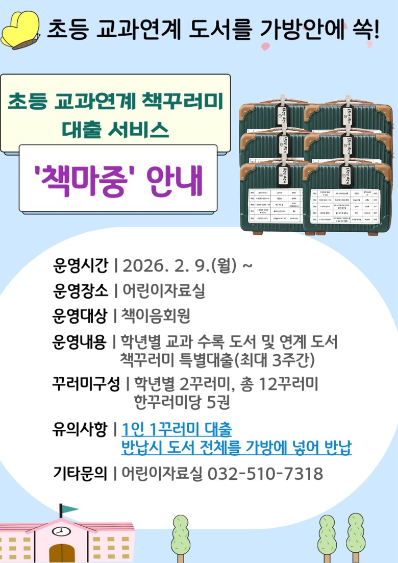 운영 방식은 초등 1학기 교육과정 수록 도서 및 연계도서 5권을 전용 가방과 함께 제공하는 ‘책꾸러미 대출’ 형태로 운영한다.
