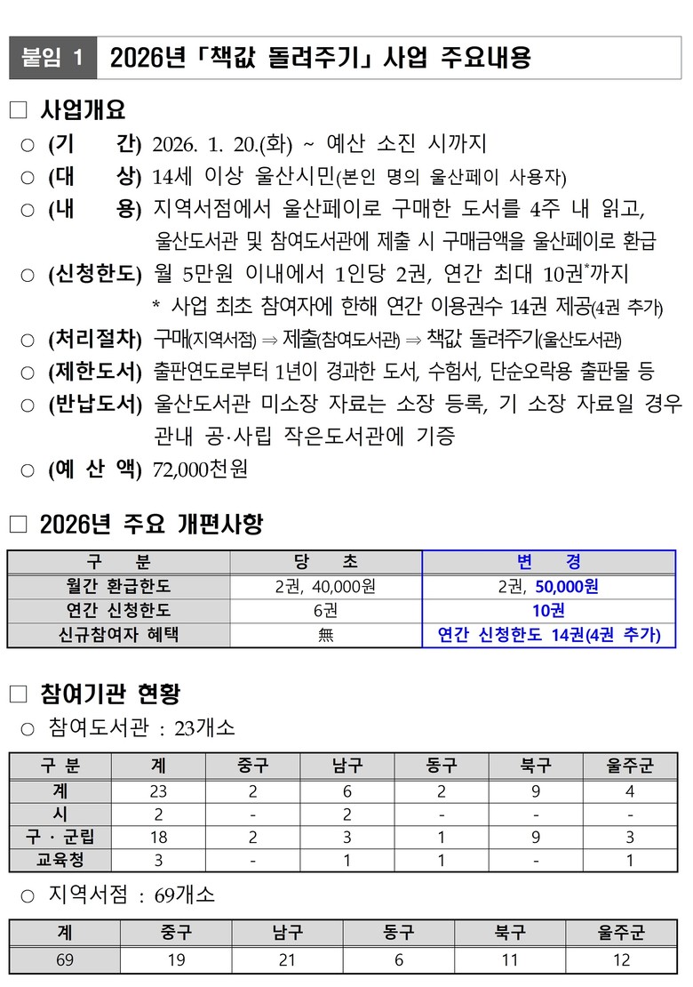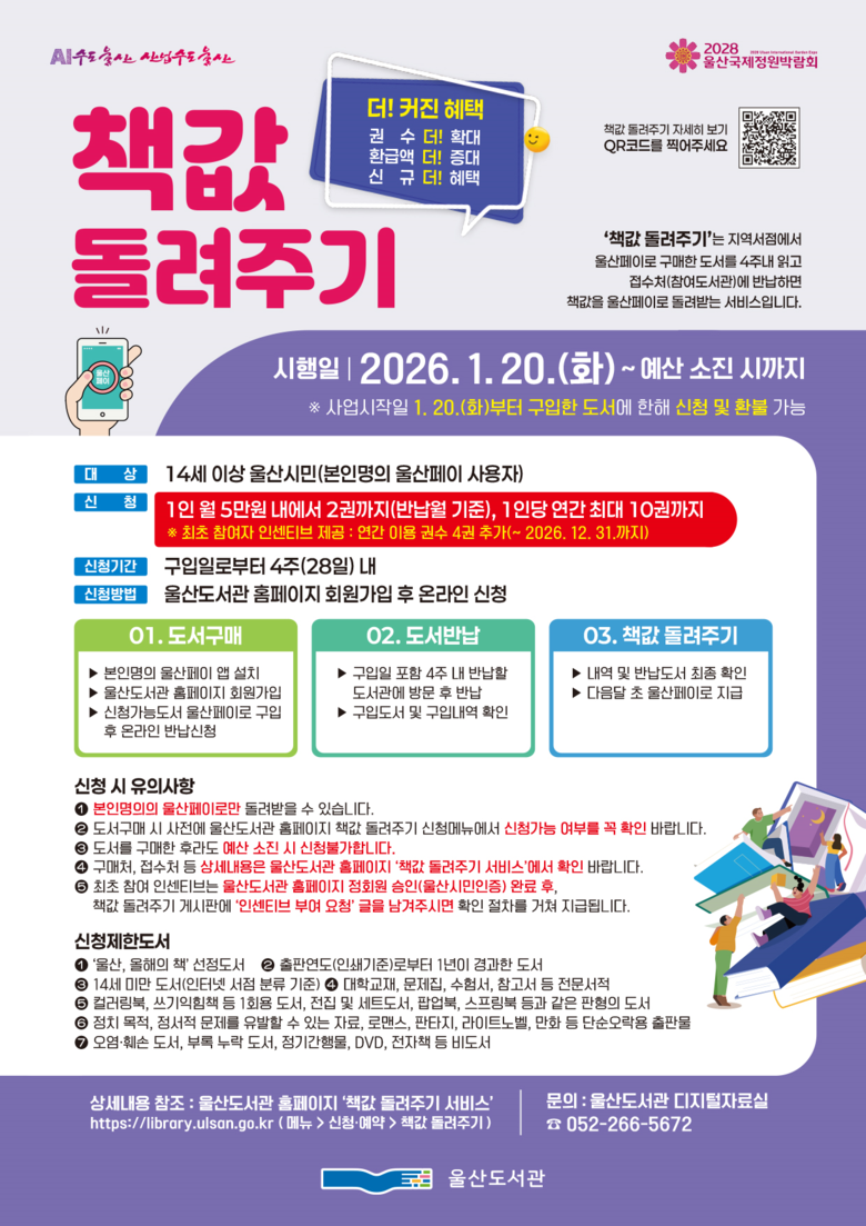 울산도서관은 시민들의 독서 문화를 확산하고 지역 서점 활성화를 위해 추진 중인 2026년 ‘책값 돌려주기’ 사업을 1월 20일부터 시행한다고 밝혔다.
