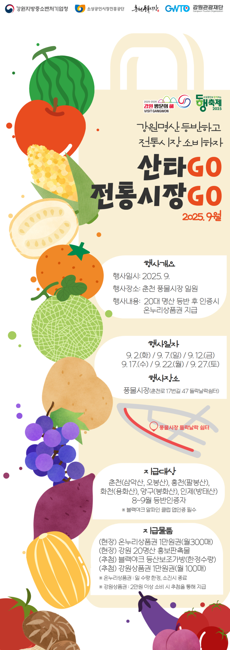 본 이벤트는 8~9월 중 춘천 풍물시장 인근의 △삼악산(춘천) △오봉산(춘천) △팔봉산(홍천) △용화산(화천) △봉화산(양구) △방태산(인제)을 등반 후 장날 풍물시장에 방문하면 다양한 혜택을 받을 수 있다.