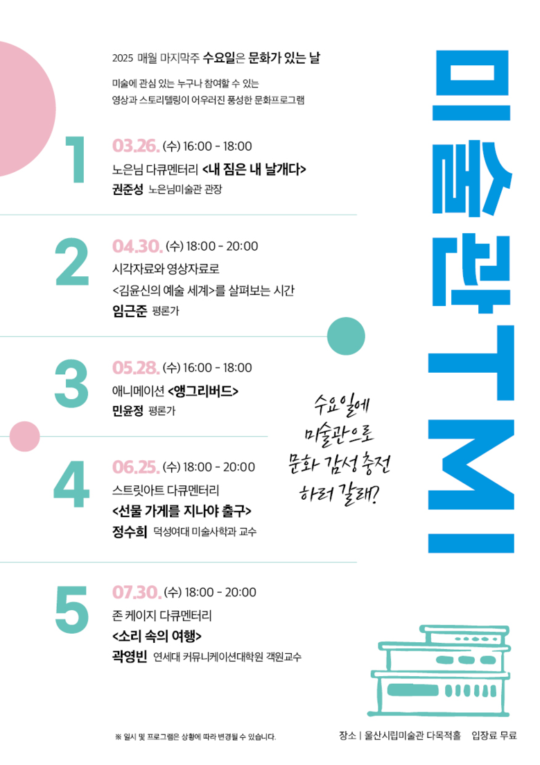 울산시립미술관 관계자는 “진행 중인 ≪리베르테(Liberté) 자유≫전시와 관련하여 관객들의 예술적 소양과 이해를 높이는 소통의 장을 위해 마련된 자리”라며 “미술관 티엠아이(TMI) 행사는 관련 분야의 전문가와 관객이 전시 및 작품에 대해 심도 깊은 대화의 시간을 갖는 프로그램으로, 시민 여러분들의 많은 관심과 참여를 당부드린다"라고 말했다.