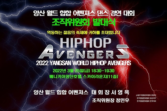 [세계타임즈=백진욱 기자] ‘양산 월드 힙합 어벤져스 조직위원회'가 양산시에서 열릴 ‘2022 양산 월드 힙합 어벤져스 댄스 경연대회(World hiphop Avengers 2022 in YANGSAN)’의 성료를 기원하며 발대식을 개최한다고 밝혔다.
