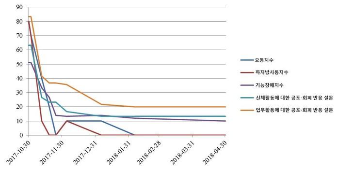 신체활동과 업무활동에 대한 FABQ도 치료 2개월 이후부터는 지수가 6점 수준에서 1점 수준으로, 8점 수준에서 2점 수준으로 각각 감소했다. 디스크 낭종 흡수에 따른 통증 감소로 일상생활의 장애가 유의미하게 해소된 것이다.