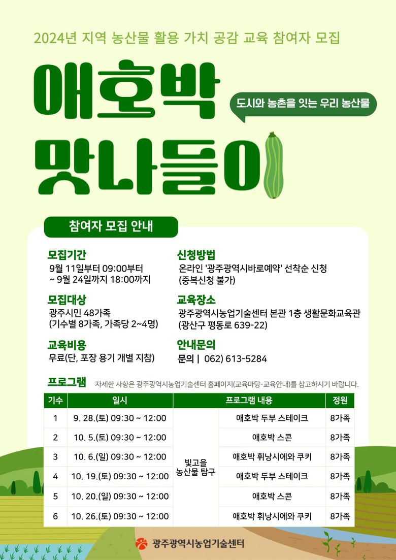 ※ 광주광역시바로예약(https://www.gwangju.go.kr/reserve/)→광산구→ 교육/강좌→광주광역시농업기술센터→2024년 지역 농산물 활용 가치 공감 교육
