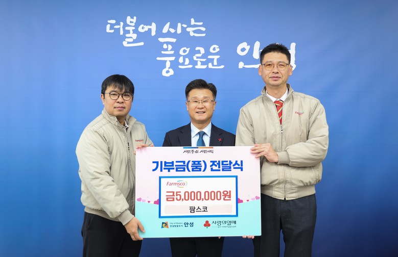 ㈜팜스코는 안성시 제2공단에 위치한 사료 제조 및 유통 전문 기업으로, 매년 연말 안성시에 꾸준한 기부를 이어오며 상생의 가치를 실천하고 있다. 이번 기부는 ‘함께 성장하는 지역사회’를 만들기 위한 기업의 사회적 책임을 다하기 위한 취지에서 마련됐다.