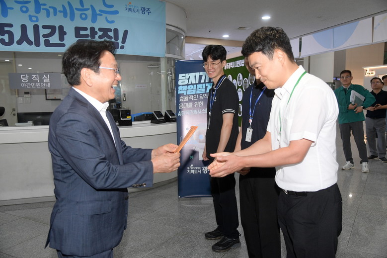당직제 폐지 첫날인 1일 오전 8시30분, 강기정 시장과 마지막 당직 근무자들은 시청 1층 당직실 앞에서 ‘당직, 뜨거운 안녕’이라는 작은 행사를 진행했다. 강 시장은 마지막 근무자들과 소회를 나누고 그동안의 노고를 격려했다. 강 시장은 시민안전을 위해 수십년간 성실히 당직업무를 수행한 공직자들에게 감사의 마음을 담아 노란색 월급봉투에 당직수당을 전달했다.