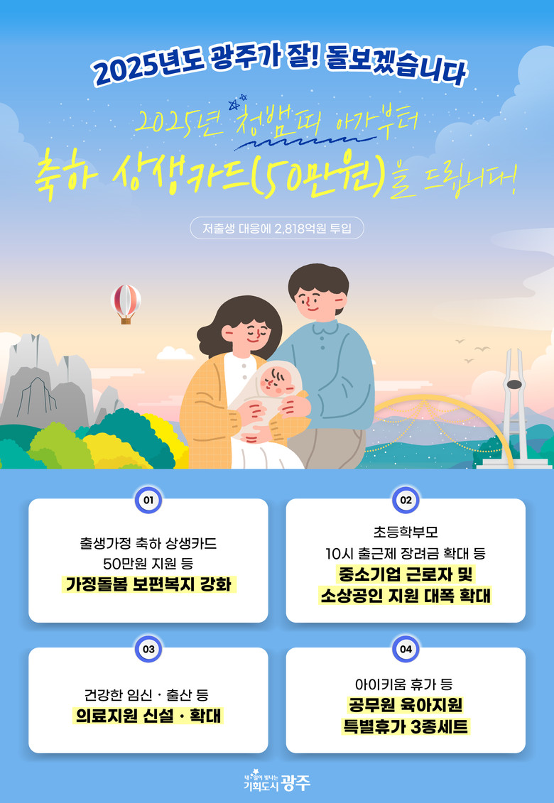 광주시는 2025년 ‘아이낳아 키우기 좋은 엄마·아빠가 편한 광주’를 만들기 위해 ‘광주아이키움 4대 케어’의 핵심분야인 의료‧돌봄‧일생활 케어를 한층 강화한다.