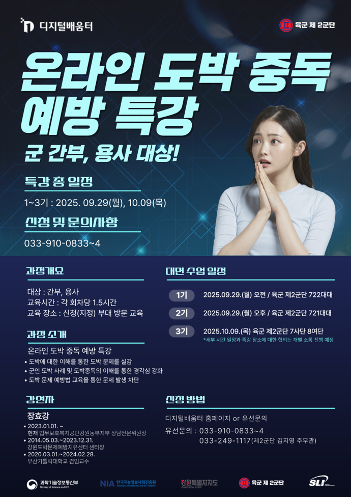 도 윤우영 행정국장은 “군 장병은 강원도의 중요한 청년 인구이며, 이들이 디지털 역량을 갖추는 것은 곧 지역과 국가의 경쟁력이 강화되는 것”이라며, “앞으로 시범사업 성과를 바탕으로 교육 대상을 확대하고, 더 많은 장병과 가족이 참여할 수 있도록 프로그램을 발전시켜 나가겠다”라고 말했다.