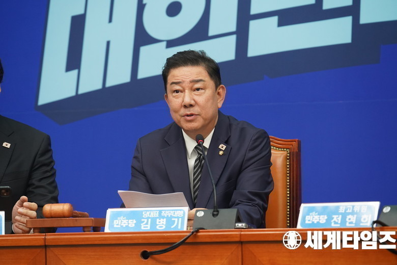 '김병기' 더불어민주당 당대표 직무대행 겸 원내대표가 25일 서울 여의도 국회에서 열린 최고위원회의에서 모두 발언을 하고 있다.