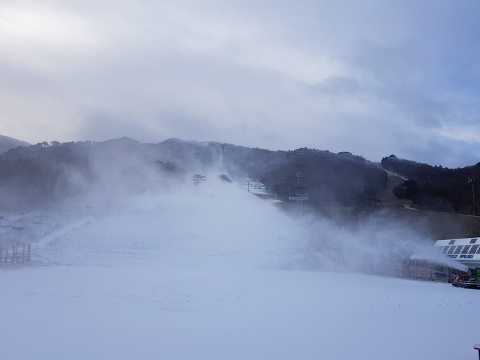 지난달 22일 부영그룹 무주덕유산리조트 스키 슬로프에 거대한 굉음과 함께 설치된 제설기에서 인공 눈들이 하얀 연기처럼 뿜어져 나오며 폭풍제설이 시작되었다. 더불어 활강코스를 점검하면서 개장 준비에 한창이다.