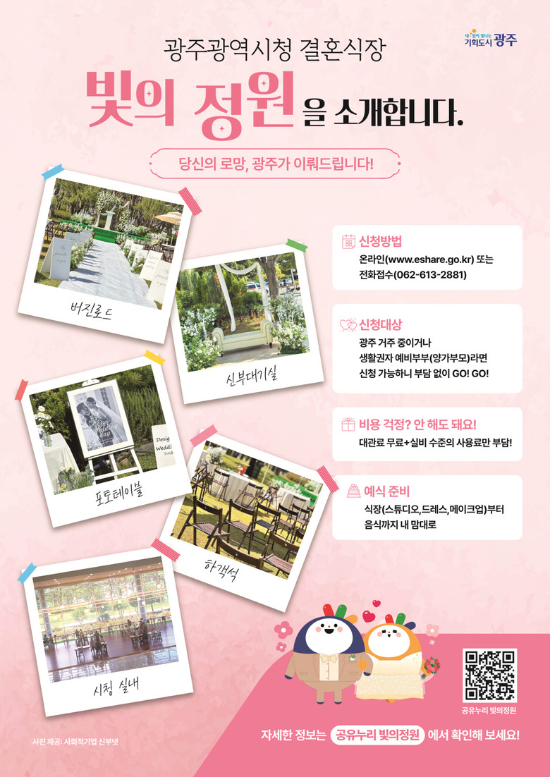 신청자는 시설 사용에 따른 실비(야외광장 등 실외는 1일 1만원‧실내는 시간당 1만원과 냉난방비 별도)만 부담하면 된다. 단, 꽃장식이나 테이블‧의자 등 비품은 개별 준비해야 한다. 광주시에 문의할 경우 관련 업체를 안내받을 수 있다.