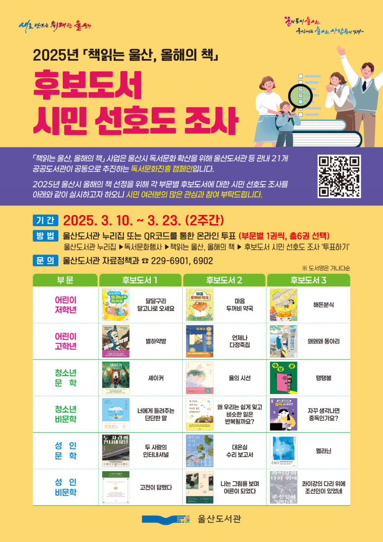 이번 시민 선호도 조사는 3월 10일부터 23일까지 울산도서관 누리집(https://library.ulsan.go.kr/prefer/insertPreferVote.do)을 통해 참여할 수 있다.