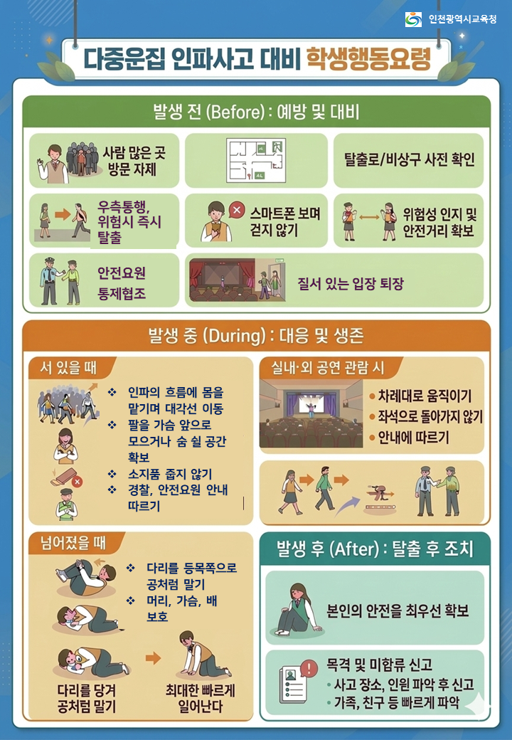 시교육청은 각 가정과 학교에 상황별 대응 지침이 담긴 ‘다중운집 인파사고 대비 행동요령’을 배포했으며, 학생과 연락이 두절되거나 위급 상황이 발생할 경우 즉시 112(실종·범죄) 또는 119(안전사고·부상)로 신고하도록 안내하는 등 예방 활동에 나섰다.