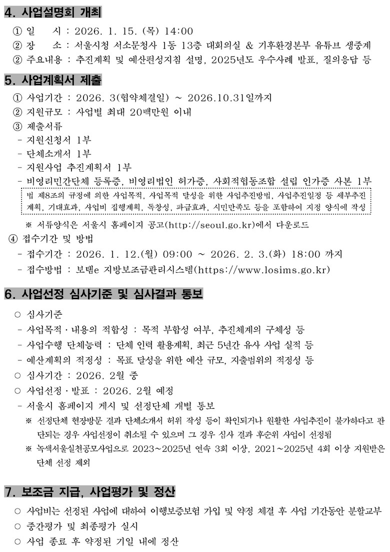 공모 신청은 1월 12일(월) 9시부터 2월 3일(화) 18시까지 지방보조금관리시스템 (보탬e, https://www.losims.go.kr)을 통해서만 가능하며, 선정 결과는 2월 중 서울시 누리집(www.seoul.go.kr)을 통해 발표한다.