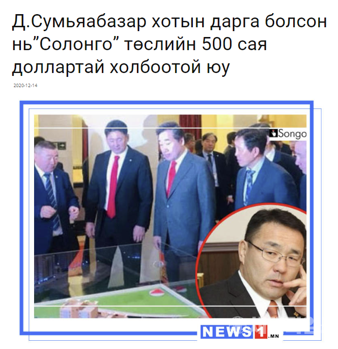 이어 “앞서 지난 2020년 12월 14일경 몽골언론 <NEWS1>은 'D. Soumyaabazar(울란바트로 前 시장)이 시장에 취임한 것은 솔롱거 프로젝트1,2 ($ 500,000,000)와 연관이 있는가?'라는 제목의 기사를 통해 한국 EDCF 사업의 부당한 거래를 폭로하기도 했다”면서 “이 사업은 몽골 국회가 2017~2019년 대외경제개발 협력기금 차관에 관한 몽골 정부와 한국 정부 간의 일반 협약 체결 지지로 이루어졌으며 한국에서 5억 달러를 30년 동안 0.2% 금리로 차입하는 조건이었다”고 설명했다.