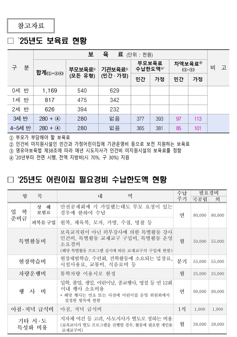 어린이집 특별활동비·차량운행비 등 보육료에 포함되지 않아 학부모가 부담해야 하는 ‘실비’ 성격의 필요경비 7개 항목 중 3개 항목의 수납한도액을 연 6만1000원 인상(입학준비금 5000원/연, 현장학습비 5000원/분기, 특성화비 3000원/월)했다. 나머지 4개 항목은 동결, 인상을 최소화했다.
