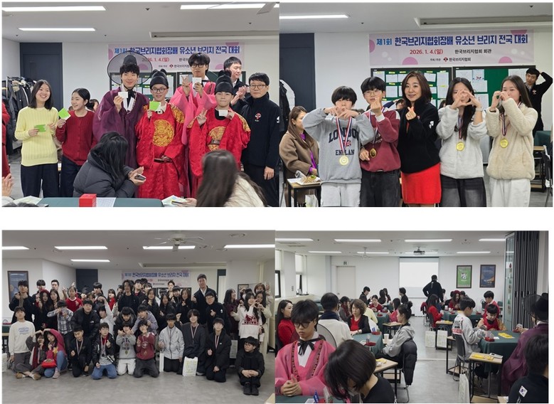 | ▲ 한국브리지협회장배 유소년 브리지 전국대회 모습(2026년 1월 4일) (상단좌측:‘레드 & 골드’ 드레스코드 이벤트 시상 장면, 상단우측: 1위 팀 세종 연양초 6학년과 세종 새움중 2학년 시상 모습, 하단좌측: 전국대회에 참가한 유소년 선수단 단체 기념사진, 하단우측: 대회 중 유소년 선수들이 집중해 경기에 임하는 모습) |