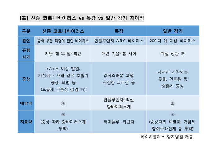 무엇보다 신종 코로나바이러스의 주요 증상인 발열, 기침, 인후통 등은 독감이나 일반 감기의 증상과 비슷해 헷갈리기 쉽다. 그러나 이 세가지 질병은 원인부터 치료법이 모두 다르다.