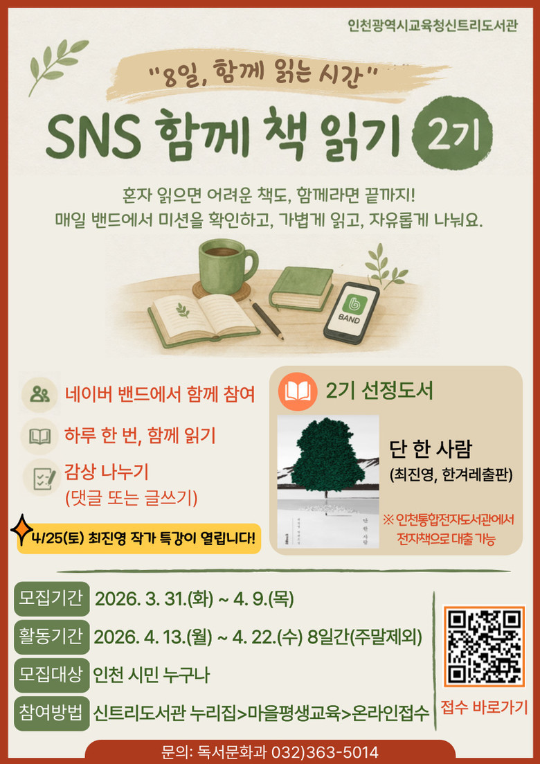 참여 신청은 3월 31일부터 4월 9일까지 신트리도서관 누리집에서 진행되며, 자세한 사항은 도서관 누리집 공지사항을 확인하거나 독서문화과(☎032-363-5014)로 문의하면 된다.