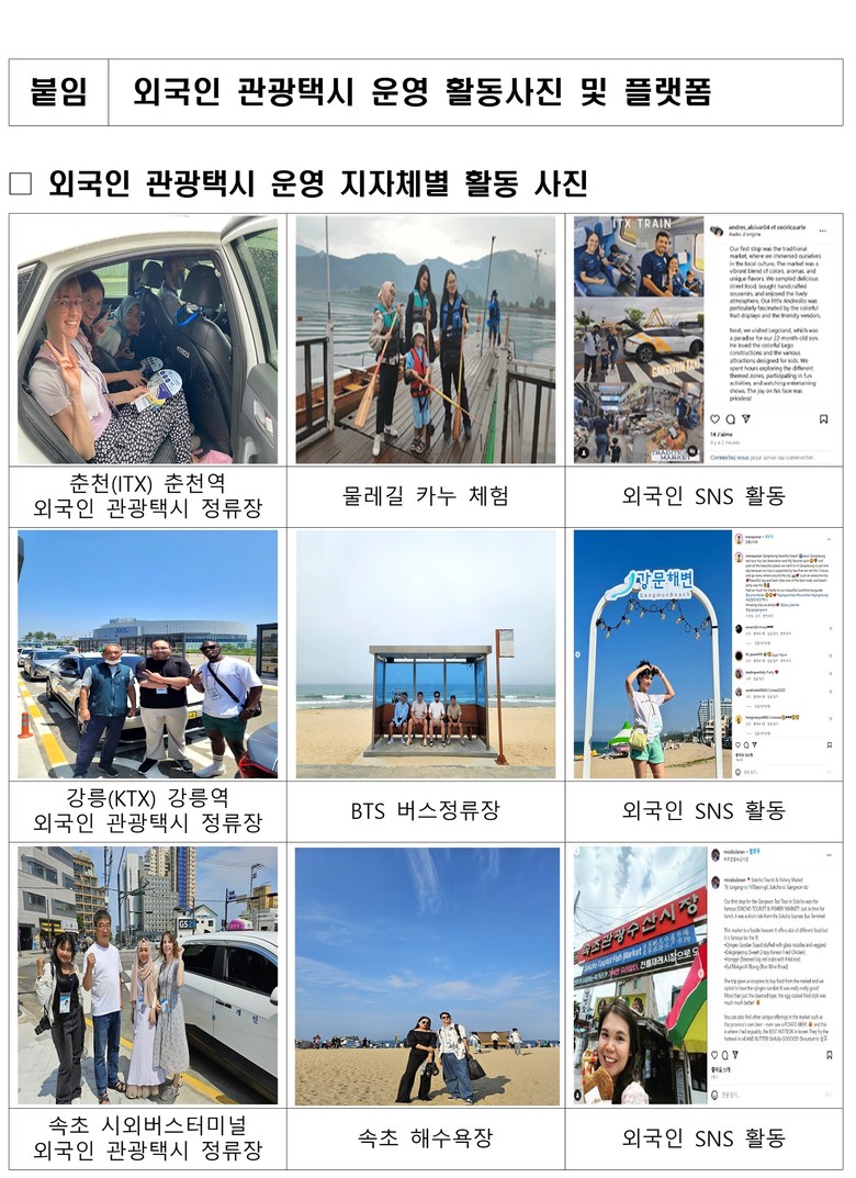 도와 춘천·강릉·속초 3개 시 및 관광재단이 공동으로 추진하는 외국인 관광택시는 교통 인프라가 취약하여 접근성이 낮은 관광지를 포함한 맞춤형 관광 상품이다.