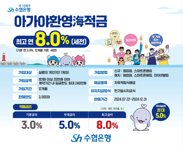 아가야환영海적금은 3천좌 한도로 한도 소진시 판매가 종료되며 전국 수협은행 영업점과 모바일뱅킹앱(파트너뱅크, 웹뱅킹)을 통해 가입할 수 있다.