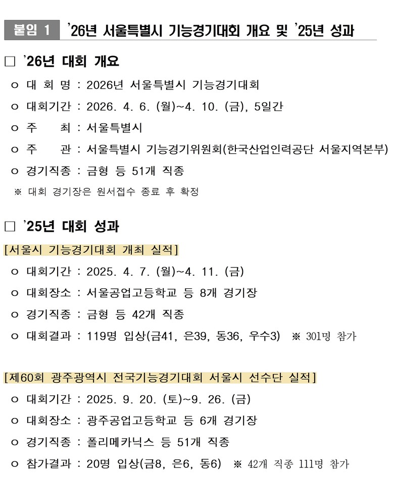서울시는 오는 4월 6일(월)부터 4월 10일(금)까지 열리는 ‘2026년 서울시 기능경기대회’의 참가자를 1월 12일(월)부터 23일(금) 18시까지 마이스터넷 누리집(meister.hrdkorea.or.kr)을 통해 온라인으로 접수한다고 밝혔다.