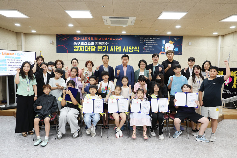 이번 시상식은 중구 청소년 방과후 아카데미 초등학생 30여 명을 대상으로 지난 4월 3일부터 7월 10일까지 약 3개월간 진행된 어린이 양치 대장 뽑기 사업의 일환으로, 최종 우수 참여자 5명을 양치 대장으로 선정해 상장을 수여했다.