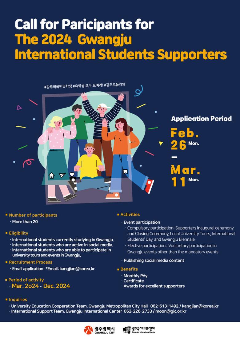 신청을 희망하는 유학생은 광주시 누리집 고시·공고에 게시된 공고문을 참고해 신청서를 내려받아 작성 후 이메일로 제출하면 된다. 신청 접수는 3월 11일 오후 6시까지이다.