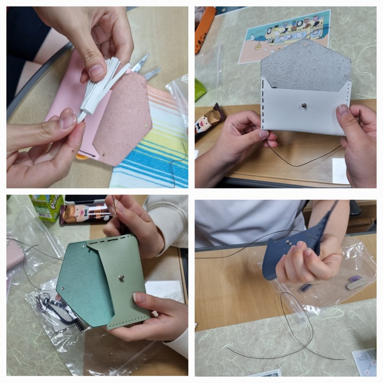 가공이 완료된 크롬 가죽에 바인딩 후 꾸미고, 태슬을 만들어 나만의 가죽 카드 지갑을 만들었다.