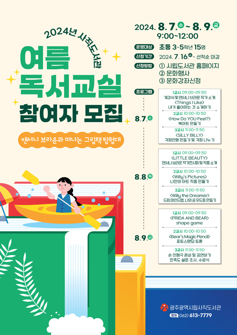 자세한 사항은 시립도서관 누리집(https://citylib.gwangju.kr)을 참고하거나 각 도서관 어린이실(무등 062-613-7743, 사직 062-613-7779, 산수 062-613-7812)로 문의하면 된다.