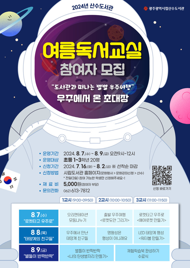 산수도서관은 8월 7일부터 9일까지 초등학교 1~3학년 20명을 대상으로 ‘도서관과 떠나는 별별 우주여행, 우주에서 온 초대장!’을 주제로 독후체험활동을 운영한다.