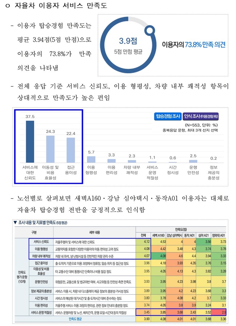 지난해 서울연구원이 서울시 자율주행 자동차 탑승객과 일반 시민 2,301명을 대상으로 실시한 조사에서 서울시에서 운영 중인 자율주행 자동차를 이용해 본 탑승객의 73.8%가 서비스에 ‘만족’(만족도 평균 3.9점/5점)하고, 82.6%가 향후 재이용 의사를 밝혔다. A160 노선의 서비스 만족도는 평균 4.08점으로 대부분의 이용객으로부터 높은 평가를 받았다.