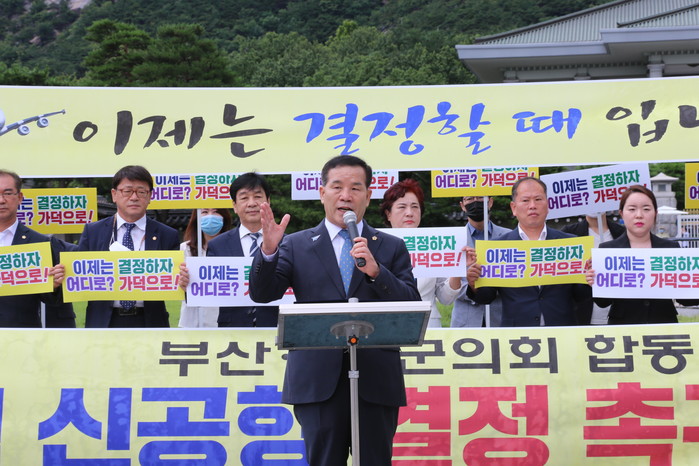 신상해 의장은 모두발언을 통해 “800만 부·울·경 지역민들의 간절한 염원을 안고 천신만고 끝에 출발한 국무총리실의 김해신공항 검증이 공회전만 거듭할 뿐 결론을 내리지 못하고 있는 상황에서 시의회와 구·군의회가 지역민의 애끓는 심정을 전하고자 여·야를 넘어 하나로 뜻을 모았다”고 말하고 “수도권 중심주의에 젖은 국토부의 탁상행정으로 지난 20여 년간 한 걸음도 앞으로 나아가지 못하고 있는 가덕신공항을 이번에 결정하지 못하면 부·울·경 뿐 아니라 대한민국이 새롭게 도약할 수 있는 기회를 놓칠 것”이라고 주장했다.
