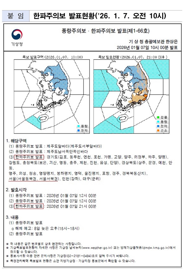 - 市, “새해 반짝 추위에 체감온도 낮아져, 건강관리에 각별히 유의 당부” [서울 세계타임즈=이장성 기자] 7일(수) 밤 9시를 기점으로 서울 동북권 및 서북권 지역에 한파주의보가 발효됨에 따라, 서울시는 한파 종합지원상황실을 가동하고 자치구 및 유관기관과 협력해 시민 보호, 취약시설 안전관리를 강화한다고 밝혔다.